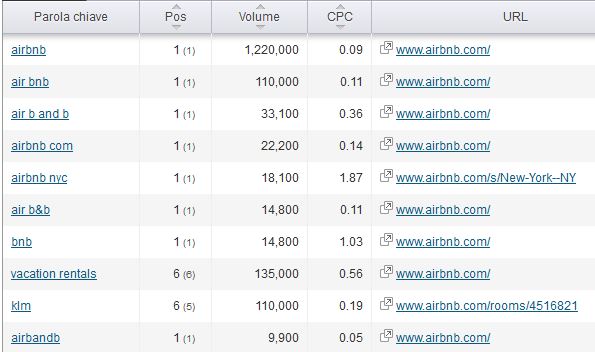 Vediamo anche l’enorme quantitativo di traffico che riesce a portare la ricerca su Google del suo brand (e notiamo anche come in USA riesca a essere tra le prime posizioni di keyword importanti come “bnb” e “vacation rentals”). Questo tipo di volumi di ricerca per il brand indica la sempre maggiore popolarità del sito e sappiamo che Google ne terrà in grande considerazione.